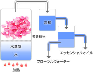 また、さまざまな抽出方法がありますが、もっとも多いのは水蒸気蒸留法です。精油1キロを得るために、ラベンダーの場合、約1.6トン、バラの場合、約5トンもの量を必要とします。