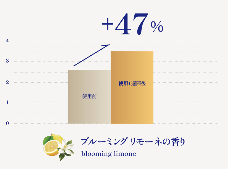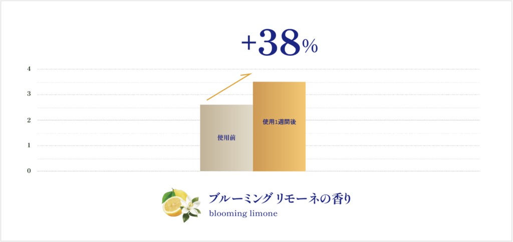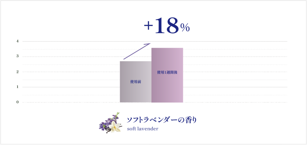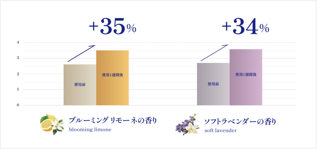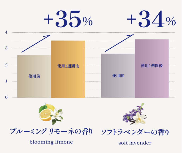 眠気や集中力の低下を感じることがあるかを聞き、使用前と比較してブルーミングリモーネの香りは+35%、ソフトラベンダーの香り+34%と、ともに改善がみられました。